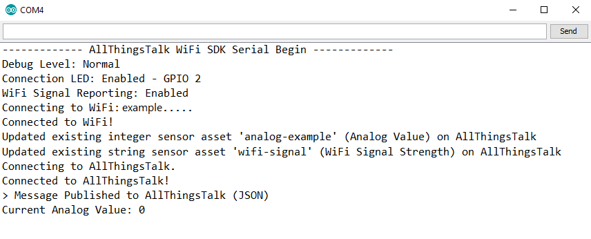 If your ESP8266 (NodeMCU) has connected to the internet and if you see the “Connected to AllThingsTalk!” in your Serial Monitor, you’re good to go!