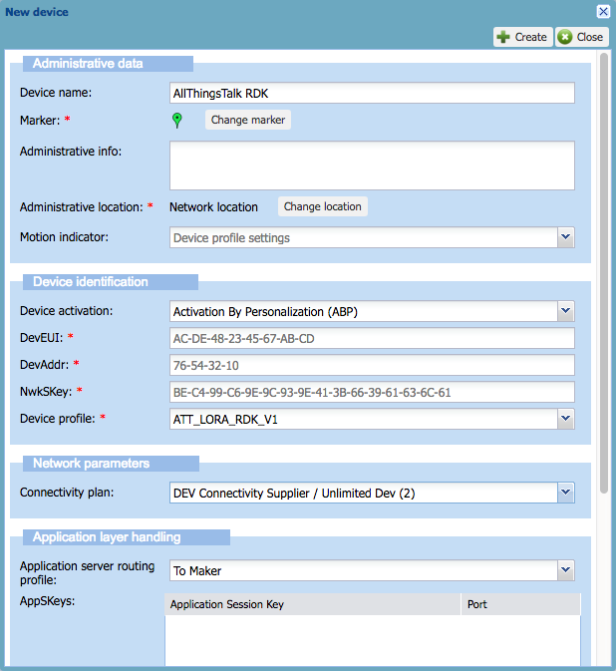 From the device screen above, you will need to copy the following fields to your LoRa device in AllThingsTalk Maker